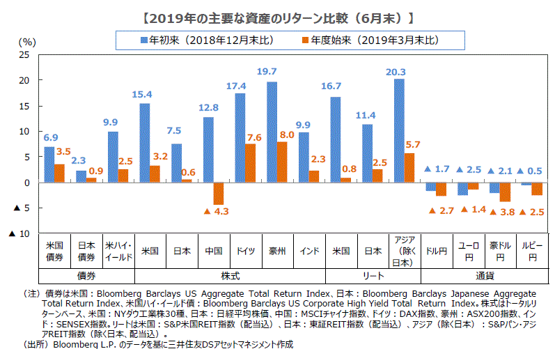 ■2019年上期(6月末時点)の主要な資産のリターンを見ると、米中貿易摩擦の激化から世界経済の減速懸念が強まるなか、米欧の中央銀行が金融政策を緩和方向に向けて舵を切ったことで、世界的にリスクオン(選好)の動きが強まり、株式、債券、リートの各資産とも堅調な展開となりました。