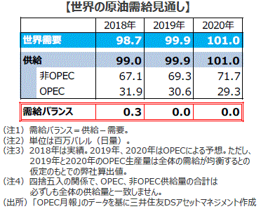 ■2019年の世界の原油需要は前年比+1.2%の日量9,987万バレルと予想されています。需給の均衡にはOPEC加盟国で3,060万バレルの供給が必要とみられますが、現状の2,983万バレル程度で推移すれば、2019年は需要が供給をやや上回りそうです。