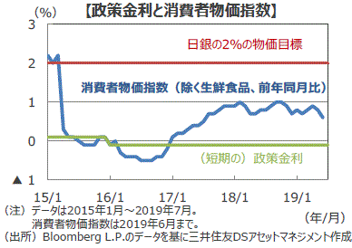 ■日銀は3カ月に一度の「経済・物価情勢の展望(展望レポート)」を公表しました。消費者物価指数(除く生鮮食品)の上昇率見通しを19年度1.0%、20年度1.3%とし、前回4月からそれぞれ0.1%引き下げました。21年度は1.6%と据え置きました。