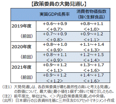 ■景気については21年度までの期間を通じて、拡大基調が続くとの認識を維持しました。成長率見通しは19年度0.7%、20年度0.9%、21年度1.1%とし、19年度と21年度を前回4月からそれぞれ0.1%引き下げました。
