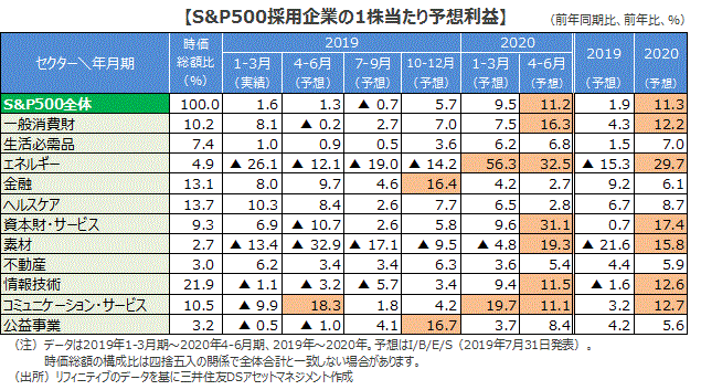 ■米企業の4-6月期決算の発表が進んでいます。調査会社リフィニティブによれば、約59%の企業が決算発表を終えた7月31日時点で、S&P500種株価指数に採用された企業の2019年4-6月期の純利益は前年同期比+1.3%です。4月1日時点の同+2.8%予想からは下方修正ですが、7月1日時点の同+0.3%からは改善しており、4-6月期の純利益は前年同期比ほぼ横ばい程度で落ち着くと思われます。