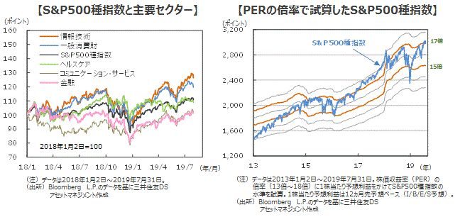 ■S&P500種指数の12カ月先予想株価収益率(PER)は17.0倍です(7月31日現在)。今後は予想PERで15倍~17倍程度のレンジで推移すると考えられます。米中貿易摩擦による生産へのマイナスのインパクトは7-9月期の業績に反映されると思われ、上値が抑えられる可能性があります。一方、FRBは景気の下振れリスクに対する警戒は緩めておらず、ハト派的な金融政策が継続するとの期待が株価を下支えする要因になると考えられます。