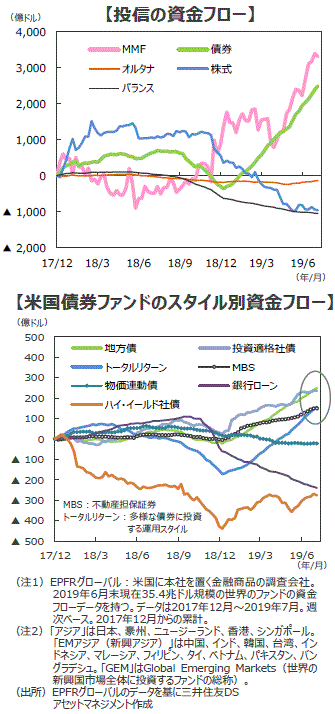 ■8月1日にトランプ大統領は9月1日から中国からの輸入品目約3,000億ドルに対して10%の追加関税を実施すると表明しました。景気の下振れリスクが高まり、米連邦準備制度理事会(FRB)の利下げも1~2回増える可能性があります。金融緩和への期待から「北米」債券ファンドへの資金流入が継続する見通しです。