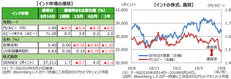 ■インドの主要株式指数のSENSEXは、8月も企業業績や米中貿易摩擦への警戒感などから軟調な動きが続いています。トランプ大統領は8月1日、ほぼすべての中国製品に制裁関税を広げる「第4弾」の発動を表明しました。米中対立の一段の激化を嫌気し、SENSEX指数は7日に約5カ月ぶりの安値水準に下落しました。その後、インド政府が外国人投資家に対する追加課税案を差し戻す意向を示したことで急反発したものの、アルゼンチン大統領選の予備選挙で左派候補が優位となったことを嫌気して同市場が急落すると、投資家のリスク回避姿勢が強まり、大幅に反落するなど振れの大きい展開となっています。