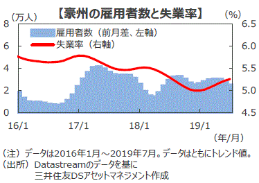 ■また、8月9日に公表されたRBAの四半期経済報告では、2020年にかけて、賃金の伸びが前年同期比+2%台前半にとどまり、消費者物価が同+2%未満で推移するとの見通しが示されました。