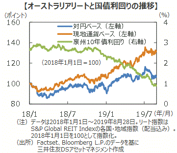 ■オーストラリアのリート市場は、豪州準備銀行(RBA) の利下げが支援材料となり、7月末比で+0.7%と概ね堅調に推移しています(現地通貨ベース、8月28日時点)。一方、8月に入り米中対立への懸念が一段と高まったことや、RBAの利下げを受けて円高が進行したことから、円ベースでは同▲4.0%と下落しています。