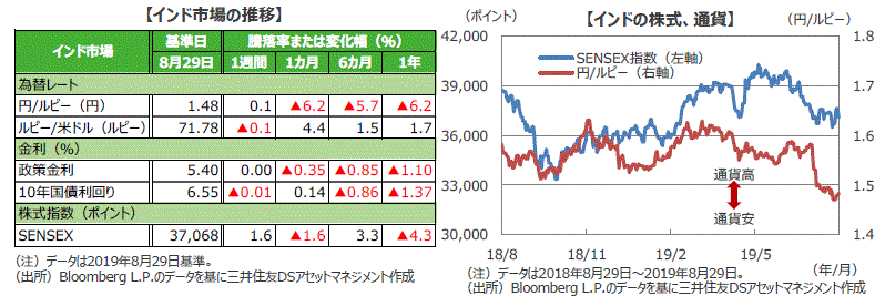 ■8月のインド株式市場は、米中貿易摩擦の激化や国内景気減速への警戒感などから軟調な動きが続きましたが、月下旬に反発し、もみあう展開となっています。インド政府は23日、外国人投資家に対する追加課税案の撤回や様々な景気支援策を発表しました。株式市場はこれを好感し、週明けの26日には、米中貿易摩擦の激化からアジア市場が大幅に下落するなかでも、急反発しました。その後は再び上値の重い展開となっています。代表的な株式指数であるSENSEXの8月のパフォーマンスは29日現在小幅安ですが、信用格付けの格下げがあった銀行株が大幅に下落するなど銘柄間格差が大きくなっています。