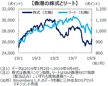 ■改正案の撤回が正式に表明される見通しとの報道を受けて、4日の香港ハンセン指数は3.9%、S&P香港REIT指数は5.8%と大幅に上昇しました。デモ活動の規模縮小が確認できれば、経済活動は正常化に向かうほか、株式やリートなどもデモ活動による下落分を回復する方向に動くと予想されます。