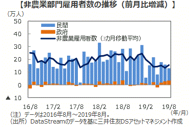 ■2019年8月の米非農業部門雇用者数は前月比13.0万人増となり、ブルームバーグ集計による市場予想(16.0万人増)を下回りました。
