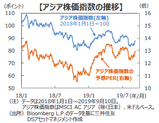 ■8月中旬にかけて大きく調整したアジア株式市場は、8月末以降、米中懸念が後退したことや中国による消費刺激策の発表などを受け、戻り基調に転じました。9月5日には、中国商務部が米中両国の閣僚級協議を10月上旬にワシントンで開催することを発表するなど、米中交渉が進展するとの期待が株価を支える要因となりました。12カ月先予想株価収益率(PER)も一時12倍ギリギリまで低下しましたが、9月10日現在では12.9倍まで回復しました。