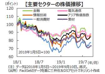 ■今後のアジア株式市場は、2つの点が注目されます。第1は、アジア株価指数の時価総額の17%を占める「情報技術」の業績と株価で、その方向性に大きな影響を与える半導体の売り上げです。2018年9月にピークを付けたアジア(含む中国)の半導体売り上げは、19年3月の201億ドルを底に7月には211億ドルと回復傾向を示しています。中国では次世代通信規格5Gの通信整備が進んでおり、2020年にかけて需要の拡大が期待されます。