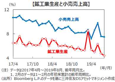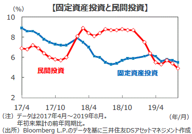 ■固定資産投資の内訳をみると、インフラ投資は前月から伸びたものの、全体の減速に歯止めがかかっていません。約6割を占める民間投資が同+4.9%と、前月(同+5.4%)から伸びが更に鈍化しました。米中貿易摩擦の激化が引き続き民間企業の投資を抑制しているとみられます。