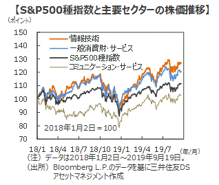 ■S&P500種指数は年初来9月19日までで+19.9%の上昇です。セクター別に見ると「情報技術」が+31.1%、「不動産」が+26.6%、「コミュニケーション・サービス」が+23.5%、「一般消費財・サービス」が+22.8%と好調です。「不動産」は米中貿易摩擦の影響を受けにくく、「コミュニケーション・サービス」や「一般消費財・サービス」は好調な米国の消費によって支えられていると考えられます。米国株式市場の売上高の地域別構成比を見ると米国が62%を占めていることからも窺えます。一方、「情報技術」は、米国は44%に過ぎず、アジアが30%(中国14%)、欧州が16%を占めるなどグローバル展開が大きな特徴です。米国内の堅調な需要に加え、アジア・中国やその他グローバルな需要も取り込んでいると思われます。