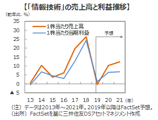 ■加えて、「情報技術」が引き続きけん引役になると思われます。「情報技術」には半導体製造装置等が含まれますが、ソフトウエア・サービスのウエイトが高く、その半分以上を占めます。こうした企業はネットワーク経由のサービス(クラウドサービス)やペーパーレス化に必要なソフトウエアなどを提供しています。総じて米中摩擦の影響を受けにくく、成長が期待されています。「情報技術」の売上高及び利益の伸び率は2019年を底に2020年以降回復する見通しです。2020年は半導体サイクルの改善などハード面での回復も期待されています。米国株式市場は、引き続き米中交渉に注意を払う必要はあるものの、総じて堅調な推移が見込まれます。
