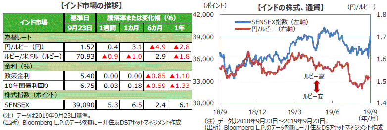 ■9月のインド株式市場は景気減速観測や原油高が上値を抑える一方、 政府による追加の景気刺激策への期待が下支えし、もみあいが続いていました。しかし、政府が20日に大幅な法人税減税を発表したことを受けて、企業収益の改善や景気の回復期待から急上昇しました。代表的な株式指数であるSENSEX指数は、19日の引け値から2営業日で、8.3%高となりました(23日時点)。法人税減税の恩恵を大きく受ける金融や製造業の銘柄がSENSEX指数の上昇をけん引しました。