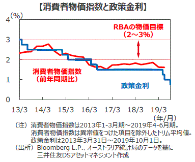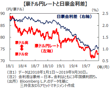 ■追加緩和の可能性が示唆されたことから豪ドルは下落しました。当面はRBAの追加利下げや米中貿易摩擦が豪ドルの重石になると見られます。一方で、鉄鉱石価格上昇などにより基礎的財政収支が改善し、来年度は12年ぶりに黒字の達成が予想されることや、利下げや所得減税などにより経済の持ち直しが期待されることは豪ドルを下支えすると考えられます。