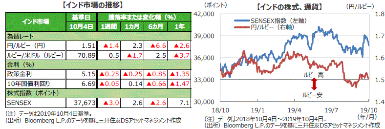■インド株式市場は、政府が9月20日に大幅な法人税減税を発表したことを受けて、企業収益の改善や景気の回復期待から急上昇しましたが、その後は利食い売りや世界景気の減速懸念に押されて反落しました。代表的な株式指数であるSENSEX指数は、9月に3.6%高となりましたが、10月に入り▲2.6%安となっています(10月4日時点)。インド準備銀行(RBI)は10月4日に追加利下げを決定しましたが、市場の予想通りだったため買い材料とはなりませんでした。