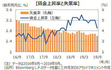 ■9月の賃金は前年同月比2.9%増と前月から伸び率が鈍化しました。前月比は▲0.04%減でした。失業率は3.5%と、1969年12月以来、約50年ぶりとなる低水準に低下しましたが、企業業績が悪化する中で、企業の雇用抑制や賃金引き上げの先送りなどから、賃金の伸びは緩やかに鈍化する可能性があります。