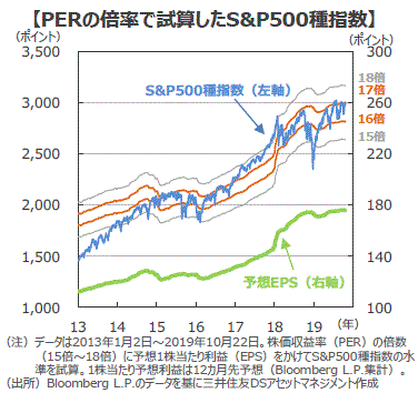 ■大きな懸念材料である米中貿易交渉は、完全合意は難しいにせよ、部分合意に目途が立ちつつあります。これまでの追加関税の影響から、もうしばらく景況感の悪化が続くと懸念されますが、年末近傍からはその悪影響が徐々に消え、景気回復の可能性が高まると期待されます。景況感の改善が見え始めれば、業績に対する増益期待も高まると思われ、米国株式市場はPER17倍の壁を超えると考えられます。