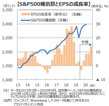 ■株価とEPSの成長率を見ると、株価は約半年程度、業績に先行してボトムを形成しています。2016年は1-3月期が利益成長のボトムとなり、2017年以降の利益拡大とともに株式市場は大幅な上昇となりました。2019年は7-9月期が業績のボトムとなる見通しで、株式市場はその後の利益回復を視野に入れ上昇していますが、株価が持続的に上昇するためにはさらなる利益成長が期待できるかが重要です。
