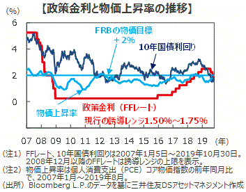 ■一方、パウエルFRB議長の会見では、米中貿易協議の部分合意の可能性や、英国の合意なき欧州連合(EU)離脱の可能性が低下したことから世界的な景気減速懸念が低減したとしながらも、見通しが変わった場合には適切に対応するとの柔軟性も示されました。また、利上げの可能性については大幅な物価上昇が必要であり、利上げへの転換はかなり先になるとの認識が示されました。
