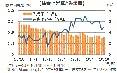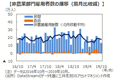 ■2019年10月の米非農業部門雇用者数は前月比12.8万人増となりました。自動車関連のストライキの影響で前月(18万人増)から減速したものの、ブルームバーグ集計による市場予想(8.5万人増)を上回る伸びとなりました。また、過去分も8、9月分にそれぞれ5.1万人増、4.4万人増の大きな上方修正が入りました。