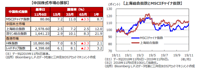 ■10月の中国株式市場は上昇しました。米中が貿易協議で11日に、「第1弾」の部分合意に至り、米国による対中追加関税の引き上げが延期されたことを好感して上昇しました。しかし、18日に中国の7-9月期実質GDPが前年同期比+6.0%と市場予想を下回ったことなどから反落し、月末にかけては景気減速懸念で伸び悩みました。11月に入り、中国株式市場は、米中貿易協議の先行きに対する期待と米国株の上昇などを背景に続伸しています。
