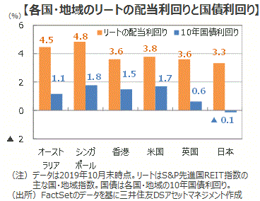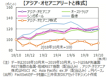 ■アジア・オセアニアリート市場は、良好な業績動向やディフェンシブ性が相対的に着目されて底堅い推移が続くと見られます。シンガポールは、世界的な利回り商品への根強い需要に加えて、銘柄により資本調達を伴った外部成長が好感されやすい展開が予想されます。オーストラリアは、低金利環境が支援材料となり安定的に推移すると見られます。物流やオフィス市況は好調で、関連セクターのリート業績見通しは底堅い推移が見込まれます。また、低迷してきた住宅市況には底入れの兆しが見られます。香港は、リート価格の調整が一段落しつつあり、米国の利下げを支えに横ばい圏での推移が予想されます。香港最大手のリートでは、デモの影響を比較的受けにくいテナントが多いことから堅調な決算が予想され、中期的には緩やかな上昇基調に戻ることが期待されます。