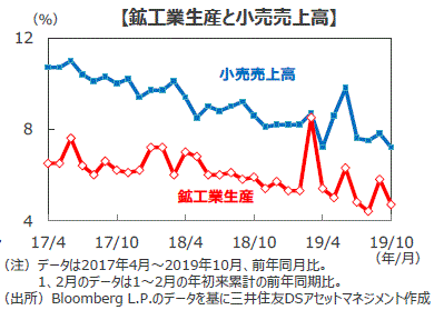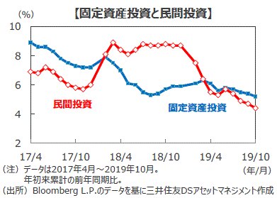 ■固定資産投資の内訳をみると、約6割を占める民間投資が同+4.4%と、1~9月(同+4.7%)から更に鈍化しました。米中貿易摩擦の影響で引き続き民間企業の投資が抑制されています。インフラ投資も同+4.2%と、1~9月(同+4.5%)から鈍化しました。