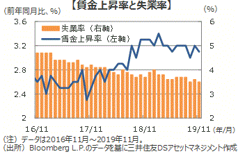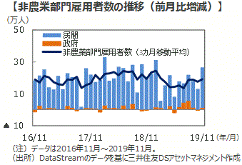 ■2019年11月の米非農業部門雇用者数は前月比26.6万人増となり、市場予想の同18.0万人増を大幅に上回りました。前月の自動車関連のストライキの反動増(約4万人)という一時的要因がありましたが、その影響を除いても堅調な結果であったと言えます。