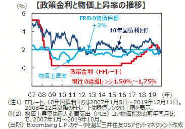 ■米連邦準備制度理事会(FRB)は、12月10日、11日に開催した米連邦公開市場委員会(FOMC)で、政策金利であるフェデラルファンド(FF)レートの誘導目標レンジを1.50~1.75%に据え置きました。これまで3会合連続で利下げが実施されていましたが、足元の経済指標で米経済の底堅さが示されていたことから、据え置きは市場予想通りでした。