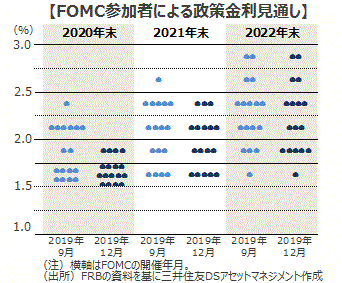 ■FOMC参加者による経済・金利見通し(ドットチャート)では、2020年のドット中央値は1.625%となり、参加者の多くが20年の政策金利据え置きを予想しています。21年は1.875%、22年は2.125%とドットの中央値が緩やかに上昇しています。景気・物価ともに見通しの大きな変更はありませんでした。
