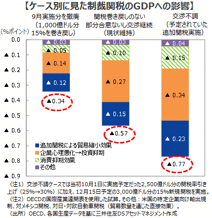 ■弊社試算では、9月1日に実施された米国の対中輸入約1,100億ドルに対する15%の追加関税が撤回された場合、世界経済に対して+0.2%程度の押し上げ要因となります(試算では1,000億ドルとして計算)。株式市場にも上昇要因となります。
