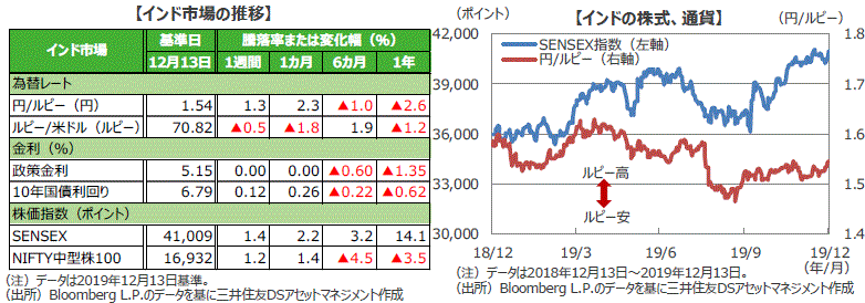 ■インド株式市場は、高値圏でもみあっています。代表的な株価指数のSENSEX指数は、11月28日に引け値ベースで史上最高値を付けた後、29日に発表された7-9月期のGDP成長率が前年同期比4.5%と6年半ぶりの低水準にとどまったことや、12月5日にインド準備銀行(RBI)が大方の予想に反して追加利下げを見送ったことが嫌気されて、やや上値が重くなりました。その後、先週末には米国が中国との貿易協議で第1段階での合意に達すると報じられたことや、英選挙で与党保守党の過半数確保が確実になったことから投資家のリスク選好姿勢が強まり、再び最高値に迫る展開となりました。