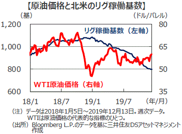 ■2019年の原油価格は、代表的な指標であるWTI先物価格で年初の1バレル当たり46.54米ドルから、協調減産やイラン産原油の禁輸措置を背景に同66.30米ドルまで上昇した後、いったん下落に転じ、7月以降は概ね同55米ドルを挟んだレンジで推移しています。12月は石油輸出国機構(OPEC)などの減産拡大合意や、米中貿易協議に対する楽観的な見通しから上昇傾向となり、16日の同60.21米ドルまでの騰落率は+29.4%となりました。昨年の年間騰落率は3年振りのマイナスとなりましたが、今年は総じて堅調と言えそうです。