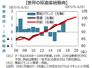■原油需要は、世界経済の持ち直しから緩やかな増加が見込まれます。OPEC月報12月号によれば、19年の原油需要量は世界全体で日量9,980万バレル、前年比1.0%増、20年は同1億88万バレル、同1.1%増と予想されています。