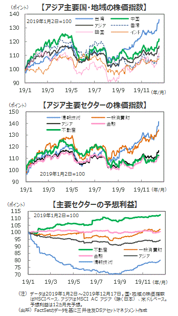 ■アジアの株式市場は、12月に入り上昇に拍車がかかる展開となりました。米中交渉が「第1段階」の通商合意に至り、12月の対中追加関税が見送られたことが最大の上昇要因です。英総選挙での保守党の大勝なども、投資家のセンチメントの改善に寄与したと考えられます。