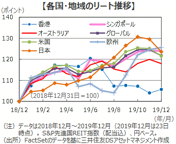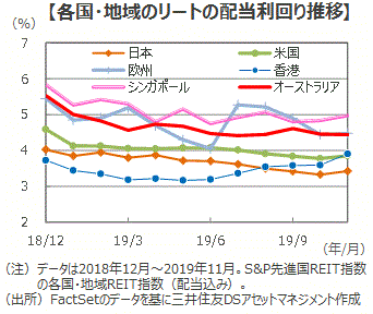 ■FRBは利下げの打ち止めを示唆するとともに、利上げを急がない姿勢も示しており、当面政策金利を据え置く見通しです。また、米中貿易交渉も第1段階の合意に至り、世界経済回復への制約が和らぐことから、景気は2020年にかけて緩やかな持ち直しが期待されます。長期金利は、景気の持ち直しとともに緩やかに上昇するとみられますが、FRBをはじめとする中央銀行の低金利政策が引き続き支援材料となり、2020年もリート市場は底堅く推移するとみられます。
