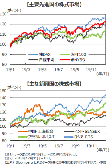 ■2019年の世界の株式市場は堅調な展開となりました。米中通商交渉の進展期待や、米連邦準備制度理事会(FRB)の金融緩和政策への転換観測などから、年初から4月にかけ上昇しました。その後、5月や8月にトランプ大統領が中国への追加関税引き上げを示唆したことで調整する場面がありましたが、FRBが7月以降3会合連続で利下げを行ったことや、米中通商交渉の進展期待が高まったことから年末にかけて上昇基調を辿りました。
