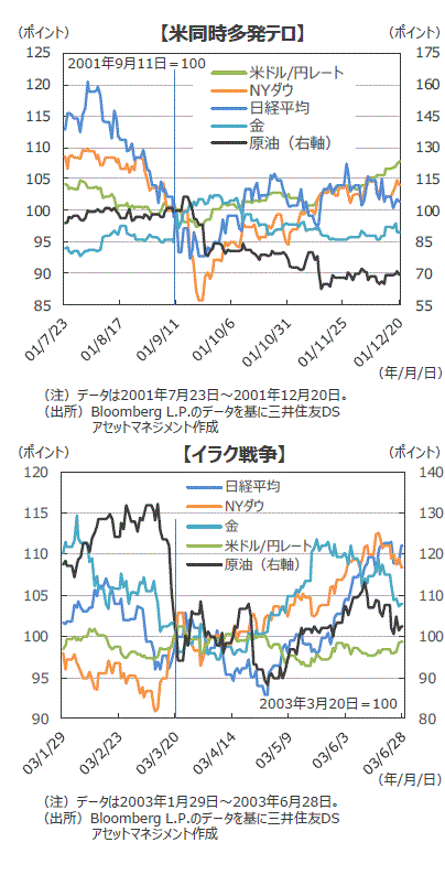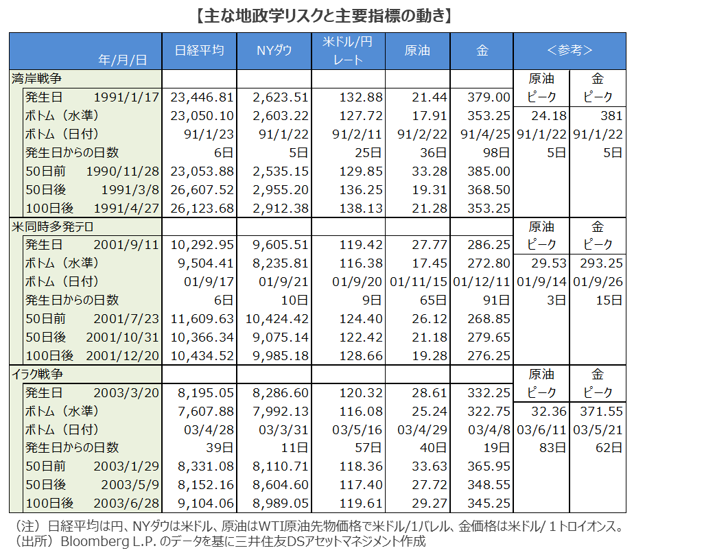 ■今回は過去の紛争時、(1)湾岸戦争、(2)米同時多発テロ、(3)イラク戦争、の主な指標の動きをまとめました。