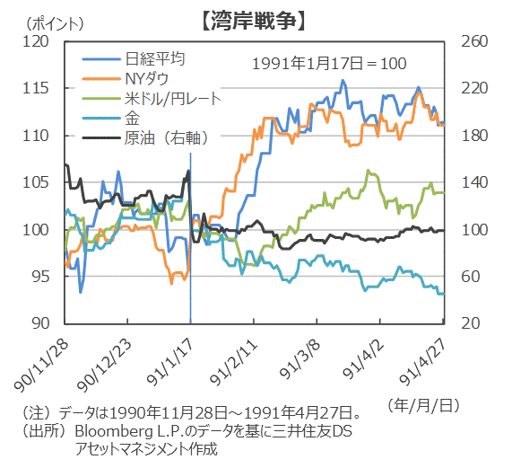 ■(1)湾岸戦争は、1990年8月にイラク軍がクウェートへの侵攻を開始したことに端を発します。米英を中心とする多国籍軍が1991年1月17日にイラクへの攻撃を開始しました。日米株式市場は90年の後半は総じて値の重い展開でした。