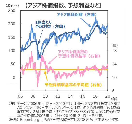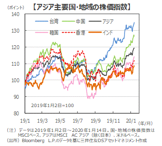 ■アジアの株式市場は、19年末から20年年初にかけてやや上値が重くなりましたが、再び上値を追う展開となりました。昨年末から1月14日までの上昇率をみると、アジア株価指数が+3.4%でした。主な国・地域を見ると、中国が+4.6%、香港+4.5%、韓国+3.3%、インド+2.7%、台湾+2.4%でした。米中は「第1段階」の通商合意について15日に署名する予定で、貿易摩擦がいったん収束することによる安心感がアジア全体に広がったことが背景です。