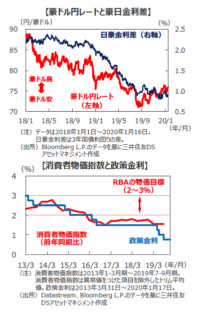 ■昨年9月以降、豪州では過去最大規模の山林火災が発生し、現在も懸命な消火活動が行われています。現時点では豪経済への影響を予測することは難しいですが、被害地域の大部分は都市部から遠く、GDP全体への影響は限定的と考えられます。豪州経済が今後回復に向かうと予想されることが下支え要因となり、豪ドルはこの1年のレンジ内での動きを想定します。但し、山林火災の長期化の影響などから民間内需や輸出の下振れ懸念が高まっていることや、一段の金融緩和の可能性には注意が必要です。