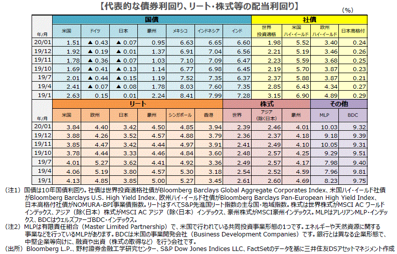 ■1月は米国株式市場で主要3指数が最高値を更新する場面もありましたが、月末の新型肺炎感染拡大に対するリスク回避の動きを受けて主な株式市場が下落したため、株式の配当利回りは概ね上昇しました。一方、豪州の配当利回りは低下しました。BDC、MLPの配当利回りはMLPが上昇し、BDCがやや低下しました。