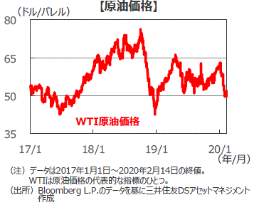 ■新型肺炎の影響により、少なくとも1-3月期は中国などの経済成長が下振れるとみられ、感染拡大やその影響には注意が必要です。原油価格は、経済減速やOPEC非加盟国の供給増と、OPEC等の協調減産や地政学リスクの高まりによる供給不安の綱引きになりますが、減産規模が十分に大きくならない限り上値は重いとみられます。3月5、6日に予定されるOPECとOPECプラスの会合での減産協議の行方が注目されます。