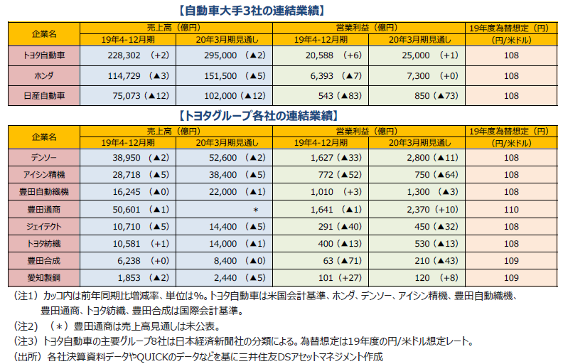 ■自動車大手3社の2019年度4-12月期の連結売上高と連結営業利益はトヨタは増収増益、ホンダと日産は減収減益となりました。国内外の大手自動車メーカーの業績が中国での販売減速や、次世代技術への先行投資負担などから低迷する中、トヨタは新モデルの投入効果などから増収増益となりました。ホンダは原価低減を進めましたが、北米やアジアでの販売の苦戦などから減収減益となりました。
