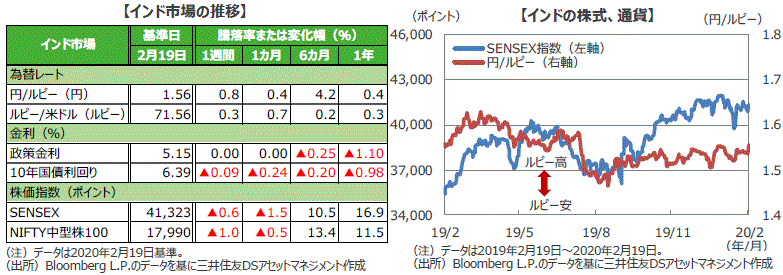 ■インド株式市場は、2月初に急落しましたが、その後切り返し、高値圏でもみ合っています。代表的な株価指数のSENSEX指数は、2月1日に発表された2020/21年度の政府予算案が市場の期待に届かなかったことから急落し、節目の40,000ポイントを割り込みました。しかし、中国当局の資金供給などで中国株が上昇すると、新型肺炎による世界経済への影響が短期間にとどまるとの見方などから買戻しが入り、急反発しました。その後は、新型肺炎の感染拡大への警戒が再び広がったことや、通信会社への貸倒懸念から銀行株が売られたことなどにより上値が重くなり、41,000ポイントを挟み、もみ合う展開となっています。