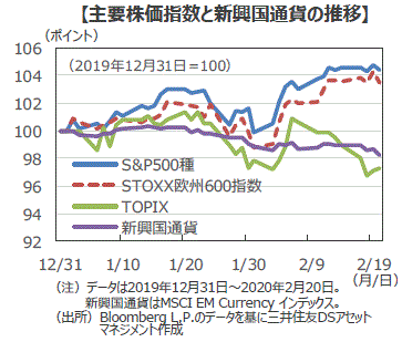 ■昨年末、中国の武漢で発生した新型肺炎の感染が拡大しています。金融市場を見ると、主要国の株式は1月こそ下落しましたが、2月に入ると米国、欧州市場が上昇に転じ、最高値を更新するなど比較的落ち着いた動きとなっています。