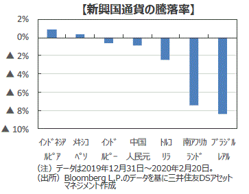 ■中国では、新型肺炎の拡大抑制のため春節休暇が延長されました。その後、企業や工場は操業を再開し始めていますが、多くの従業員が復帰できず稼働率は低位に留まっています。一方、中国政府の発表する新型肺炎の新規感染者数は徐々に減少してきており、企業の稼働率も緩やかながら高まっていくことが期待されます。そのため現在が素材需要が最も弱い時期と考えられ、今後は素材の需要が回復し、素材価格も正常化に向かうと見られます。伴って、現在は低調な新興国通貨も上昇に転じると考えられます。