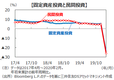 ■1~2月の固定資産投資は前年同期比▲24.5%と、2019年通年の同+5.4%から急落し、市場予想の同▲2.0%を大きく下回りました。固定資産投資の内訳をみると、約6割を占める民間投資が同▲26.4%と落ち込みました。